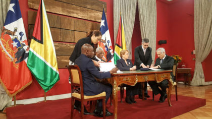 His Excellency, David Granger during an official State Visit to Chile held bilateral talks with his counterpart, Her Excellency, Michelle Bachelet. The Open Skies Air Services Agreement and the Reciprocal Visa Abolition Agreement were inked during the visit. The Agreements were signed by Ministers of Foreign Affairs of Guyana and Chile: Carl Greenidge and Heraldo Muñoz in Santiago on October 24, 2016.