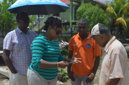 Minister within the Ministry of Public Infrastructure, Annette Ferguson and Mayor, Bartica, Gifford Marshall, discussing the flood with affected resident, Marshall