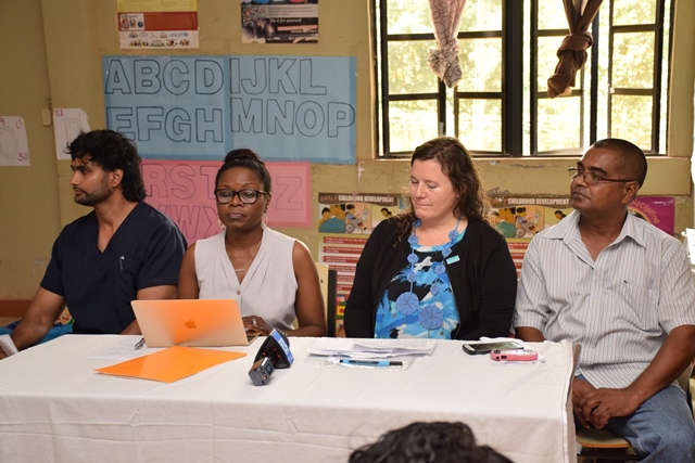 DSC_0570November 10, 2017 (from left) Medical Officer, Mahdia District Hospital, Dr. Badel Baksh, Mahdia’s District Hospital, Deputy Chief Medical Officer, (DCEO) Dr. Karen Boyle, UNICEF’s Representative, Sylvie Fouet, Regional Executive Officer, Region Eight, Gavin Gunga.