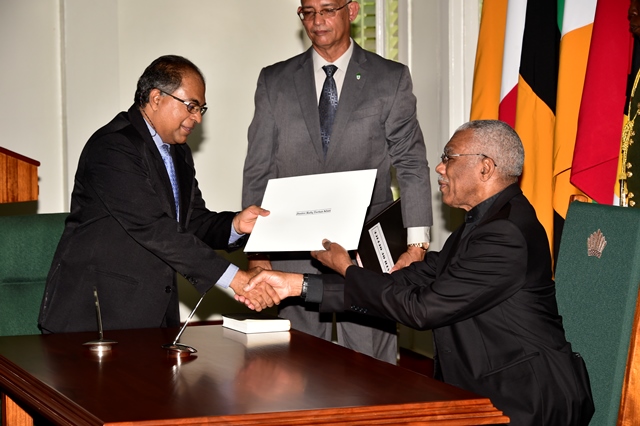 _DSC4969February 14, 2018 Justice of Appeal, Mr. Rafiq Khan receiving his Instrument of Appointment from President David Granger at State House.