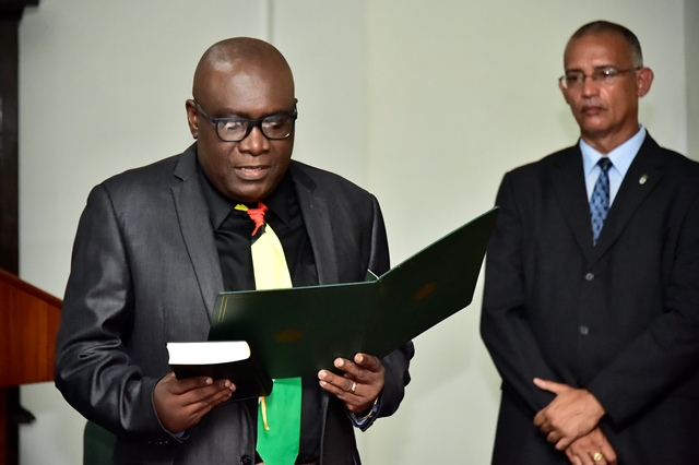 _DSC7381February 22, 2018 Chief Education Officer, Mr. Marcel Hutson taking his Oath of Office as an ex-officio member of the TSC.