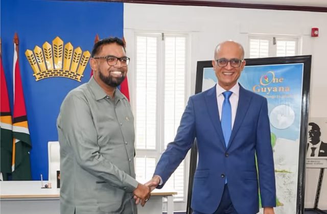 01July 9, 2024 President Dr Irfaan Ali (left) and Executive Director of CEDA, Deodat Maharaj during their meeting in February
