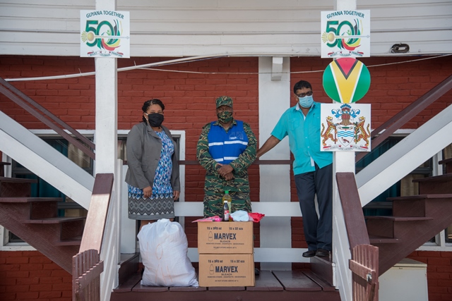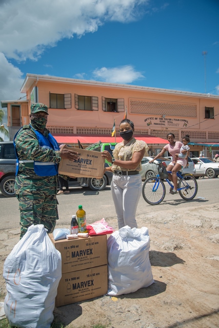 CDC Senior Response Officer, Captain Salim October presents cleaning hampers to the Town Clerk of Rose Hall Town, Natasha Griffith