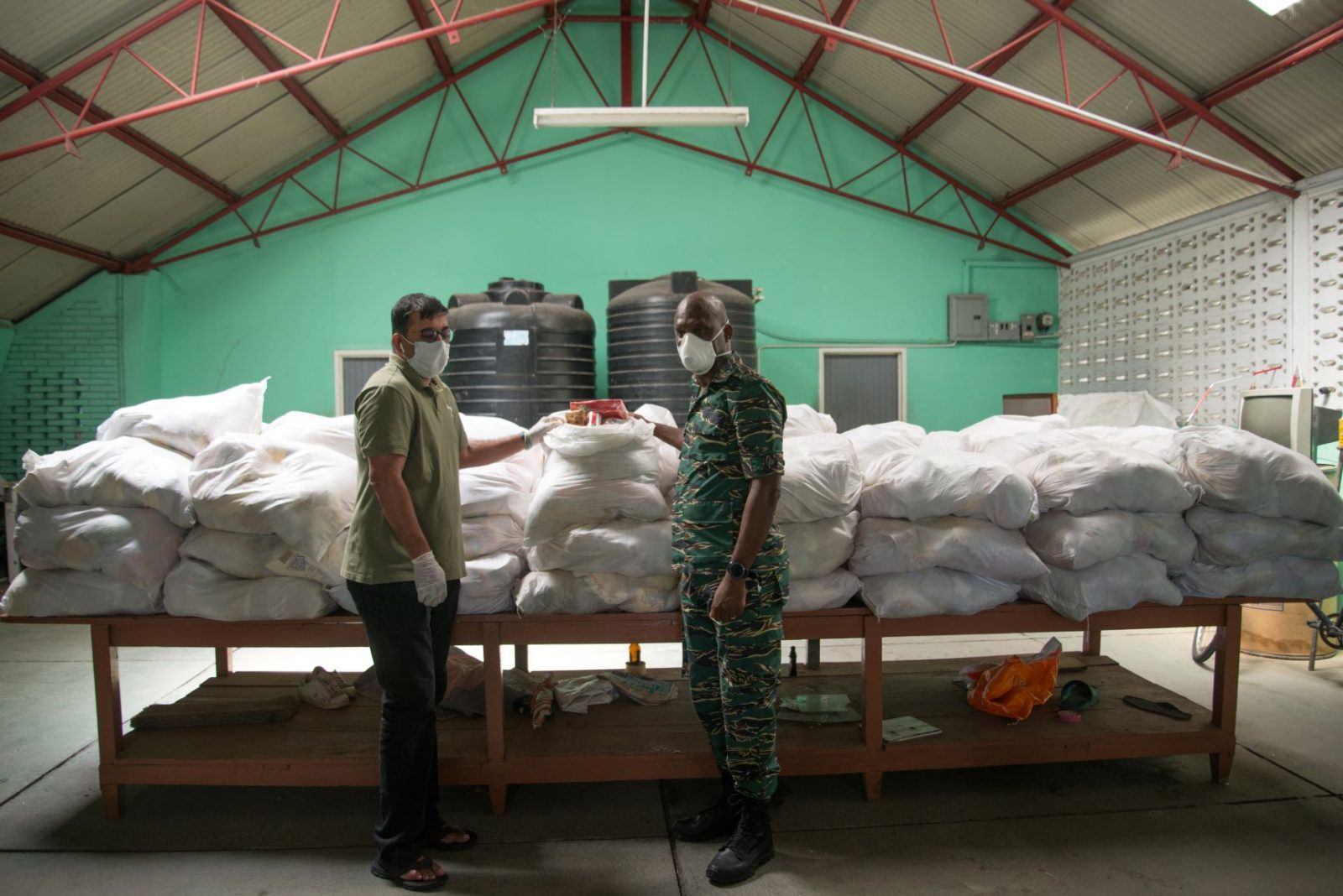 _MNP0822April 30, 2020 Director-General (DG) of CDC LieutenantColonel Kester Craig hands over hampers to Ganesh Singh, Programme Coordinatorof the Guyana Council of Organisations for Persons with Disabilities (GCOPD). Image: Marceano Narine
