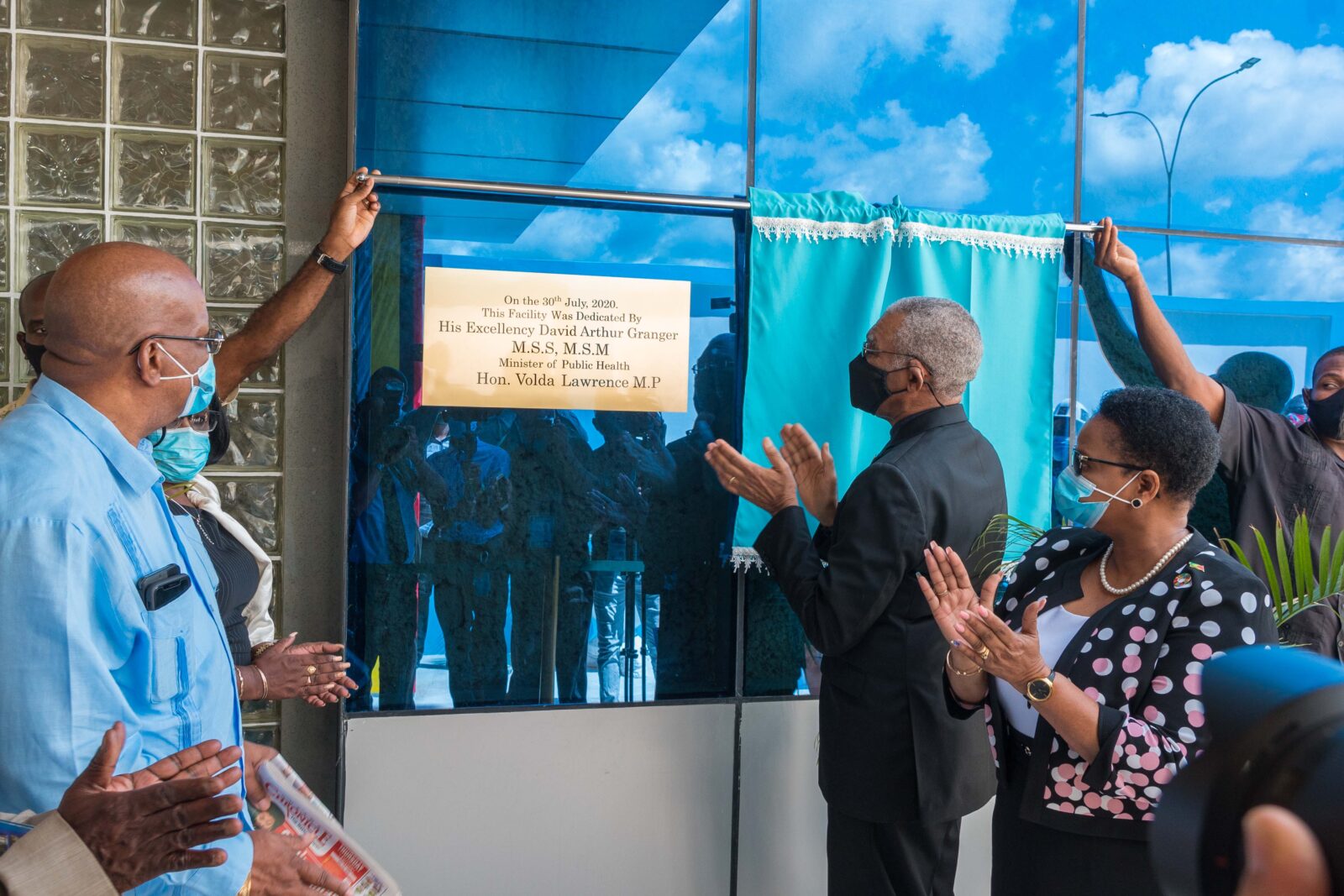His Excellency President David Granger unveils the commemorative plaque of the Centre for Disease Control and Prevention. Looking on are (right) Minister of Public Health Volda Lawrence and (left) minister of Finance Winston Jordan