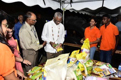 President David Granger takes a closer look at some of the products on sale and displayed at the Essequibo Agro and Trade Expo, along with President of the Essequibo Chamber of Commerce, Mr. Deleep Singh
