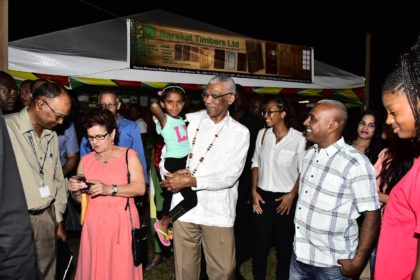 President of the Essequibo Chamber of Commerce, Mr. Deleep Singh discussing craft work on display at the Essequibo Agro and Trade Expo with President David Granger, who declared the event open