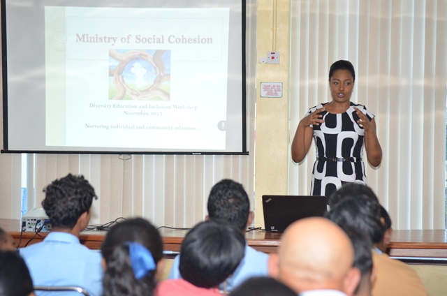 DSC_0060November 23, 2017 Olive Gopaul, Ministry of Social Cohesion, Technical Officer giving the opening presentation at the Diversity Education and Inclusion Workshop.