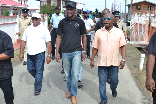 Acting Prime Minister and Minister of Foreign Affairs, Carl Greenidge (right) accompanied by Deputy Director General of the CDC, Lieutenant Colonel, Kester Craig (centre) and Regional Executive Officer, Dennis Jaikaran (left) during his walkabout in the community.