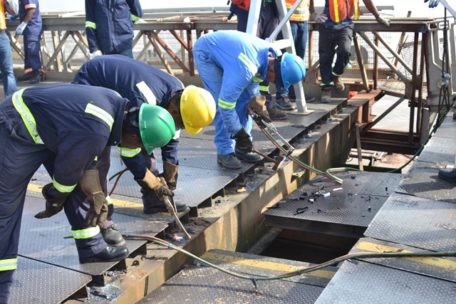 DSC_0470September 2, 2019 Emergency repair works being carried out on the Demerara Harbour Bridge. Image: Giovanni Gajie