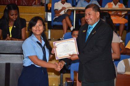 Minister of Indigenous Peoples’ Affairs Sydney Allicock handing over the certificate to a student of the Hinterland Scholarship Programme