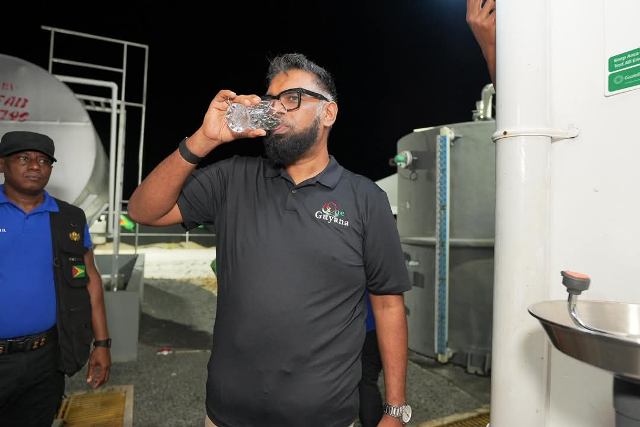 WhatsApp Image 2025-05-23 at 10.03.36 PM (1)May 23, 2025 President Dr Mohamed Irfaan Ali takes a drink from the Onderneeming Water Treatment Plant on Friday