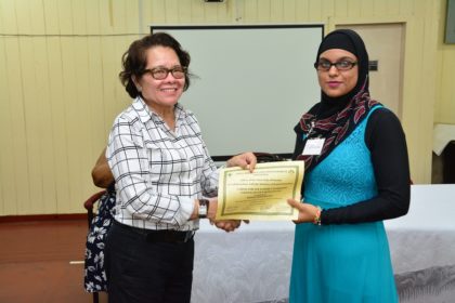 First Lady, Mrs. Sandra Granger presents Ms. Fatimah Ahmad Bacchus with her certificate at the graduation ceremony of the Care of the Elderly’ Workshop.