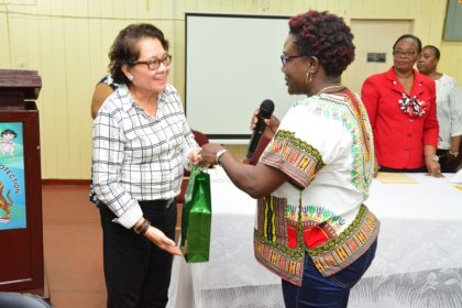 Ms. Shawndel France, another graduate from the ‘Care of the Elderly’ Workshop presents First Lady, Mrs. Sandra Granger with a token of appreciation at the close of the ceremony. Ms. Lorene Baird, Permanent Secretary, Ministry of Social Protection, is also pictured, first right.