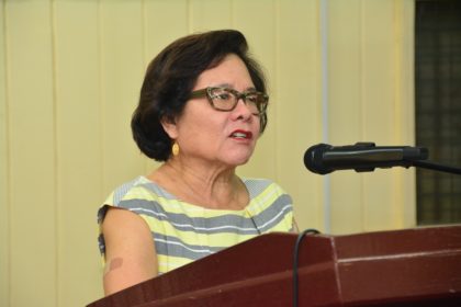 First Lady, Mrs. Sandra Granger addressing the participants of the Care for Elderly Workshop at the Ministry of Social Protection’s Boardroom, earlier yesterday