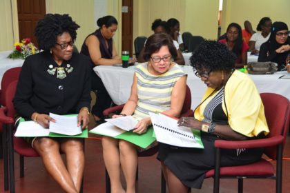 First Lady, Mrs. Sandra Granger discussing the Training Manual with Ms. Hazel Halley-Burnett (right), Gender Consultant at the Ministry of Social Protection and Ms. Yvonne Smith, of the Office of the First Lady .