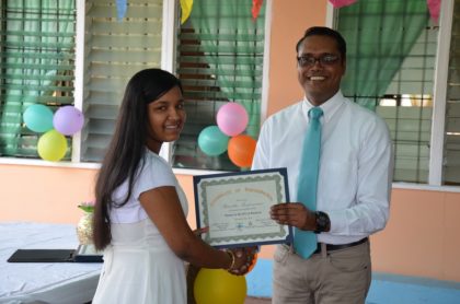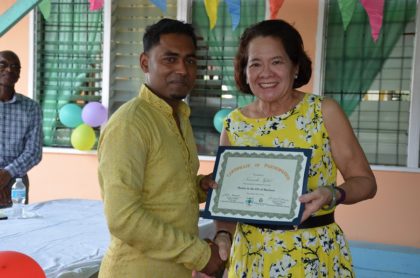 Mr. Yohann Sanjay Pooran, Facilitator at Interweave Solutions Incorporated presenting Ms. Rawattie Boopnarine with her certificate