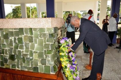 President David Granger lays a wreath at the Mausoleum in the Botanical Gardens where the late Linden Forbes Sampson Burnham was buried
