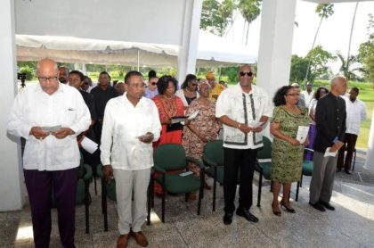 From left: Dr. Richard Van West Charles, former Opposition Leader, Mr. Robert Corbin, Minister of State, Mr. Joseph Harmon, Minister of Social Protection, Ms. Volda Lawrence and Minister of Communities, Mr. Ronald Bulkan among the attendees at this morning’s ceremony at the Botanical Gardens