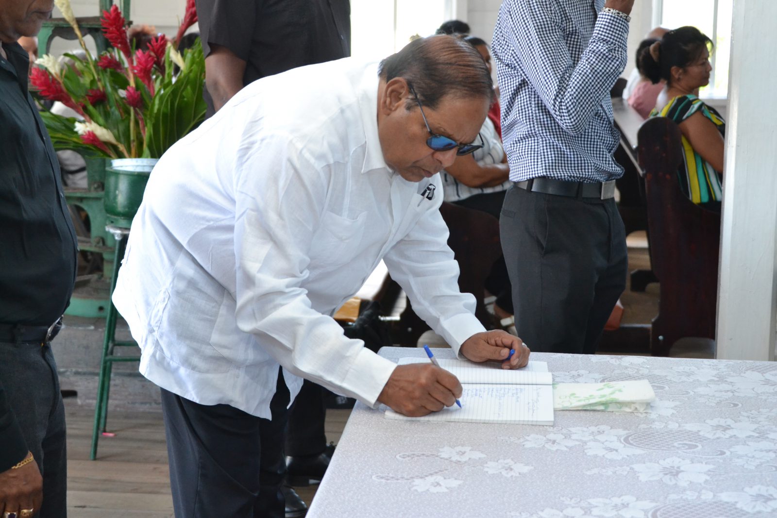 DSC_0402January 5, 2019 Prime Minister, Moses Nagamootoo signs the guest book as he arrived at the funeral service for Francis Vibert DeSouza’s at the Meadowbank Catholic Church