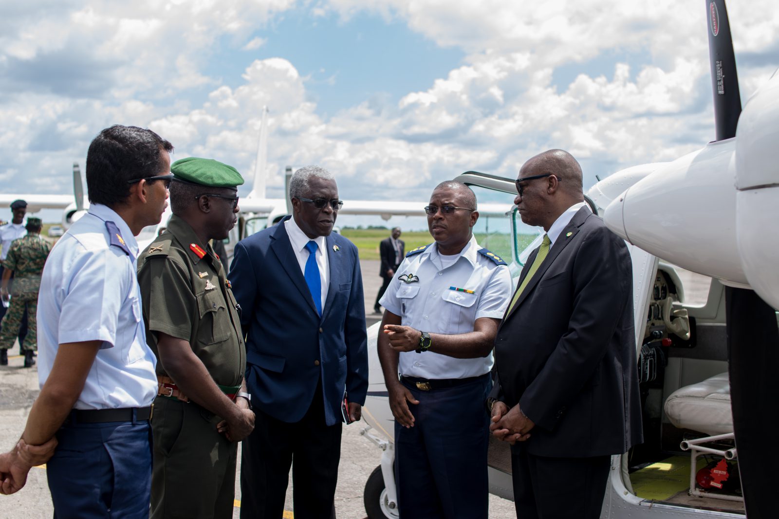 Minister Harmon in conversation with Commanding Officer of the Air Corps Lt. Col. Courtney Byrne, Director-General of the Guyana Civil Aviation Authority (GCAA), Egbert Field, Chief of Staff Brig. West and Officer in Command at the Flight Operations Department, Major Mohinder Ramjag