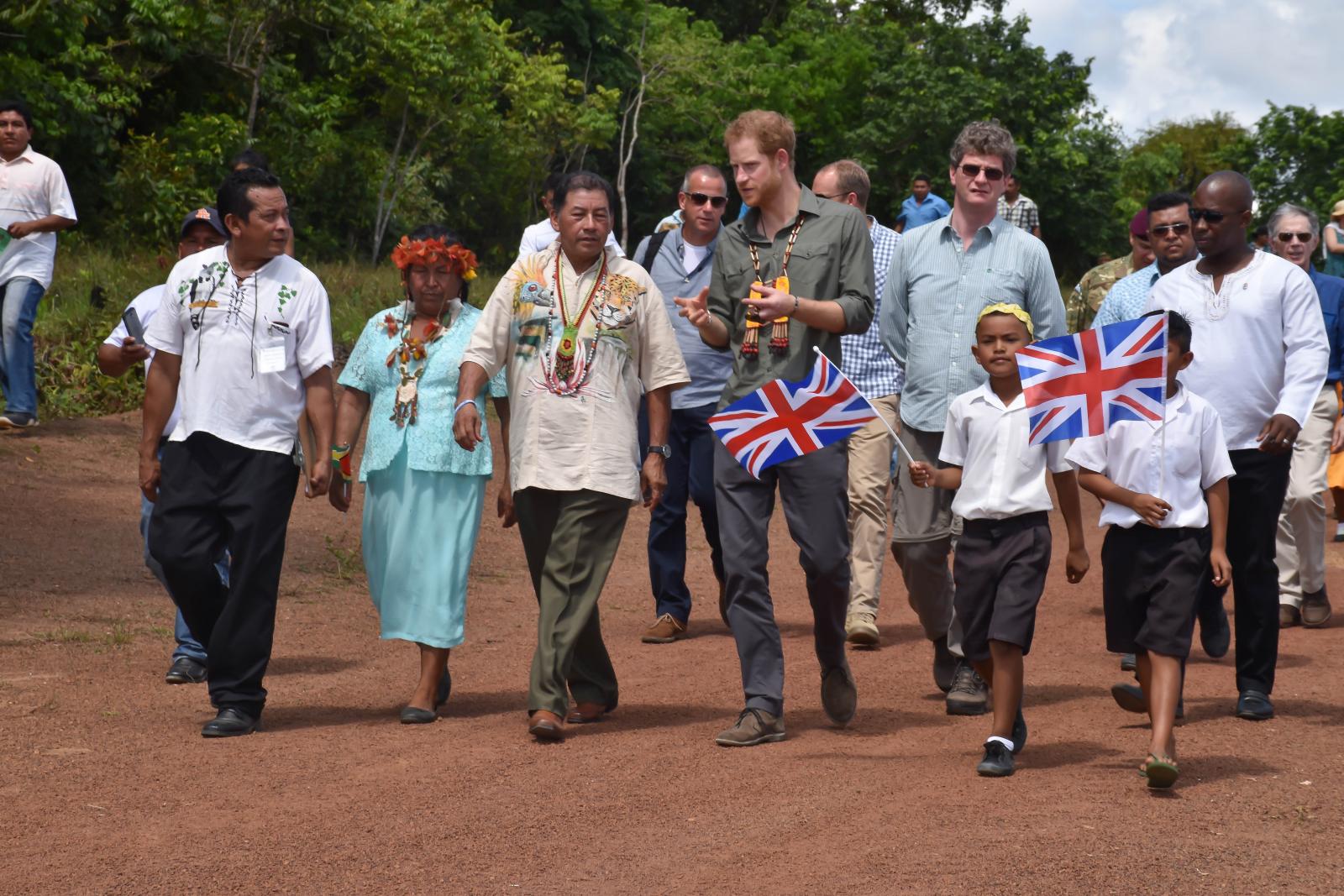 dsc_0280December 3, 2016 Prince Harry interacts with Minister of Indigenous Peoples Affairs, Sydney Allicock. Also in photo are British High Commissioner to Guyana, Greg Quinn (blue shirt, left of Prince Harry).