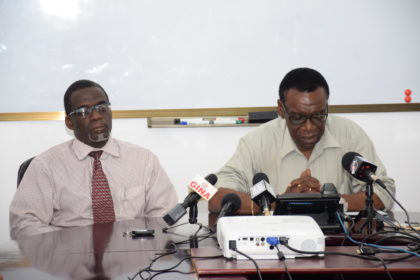 Acting chief Executive Officer, GPL Renford Homer (left) and Deputy Chief Executive Officer (DCEO), Technical, GPL, Elwyn Marshall briefing media today at the press conference at GPL
