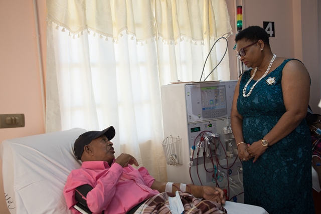 DPI9610July 5, 2020 Minister Lawrence meets with Dialysis patient Sewkarran Nanchu who shared his satisfaction with the availability of free services at the centre (Jan. 25, 2020) Image by: Aubrey Odle