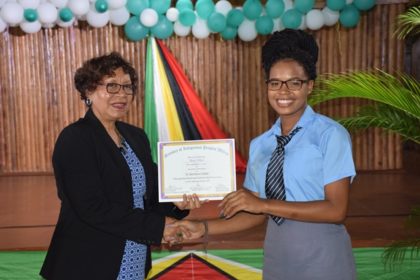 Minister within the Ministry of Indigenous Peoples’ Affairs Valerie Garrido-Lowe handing over a certificate to Shania Wilson.