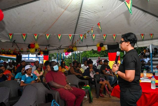 WhatsApp Image 2025-06-13 at 16.09.51 (2)June 14, 2025 Minister within the Ministry of Housing and Water Susan Rodrigues addressing the community meeting at Mahdia Township