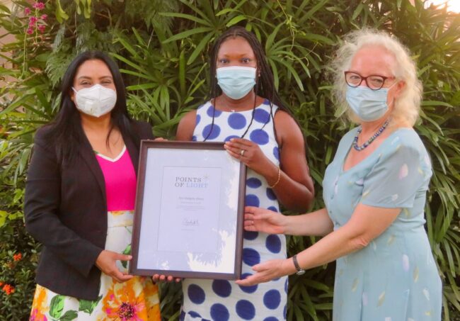Ayo Dalgety-Dean, Founder of Blossom Inc, was awarded the Commonwealth Points of Light in a presentation ceremony hosted by the British High Commissioner, Jane Miller. The Minister of Human Services and Social Security, the Honourable Vindhya Persaud, MP, handed over the award signed my Her Majesty Queen Elizabeth II.