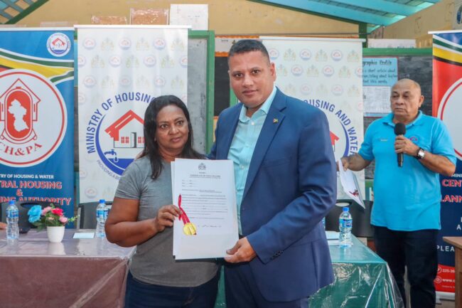 Roopnarine who has been residing in Plantation Uitvlugt since 2014, explained that he will complete some repairs on his house now that he has his title, noting that, “now I can do anything.”