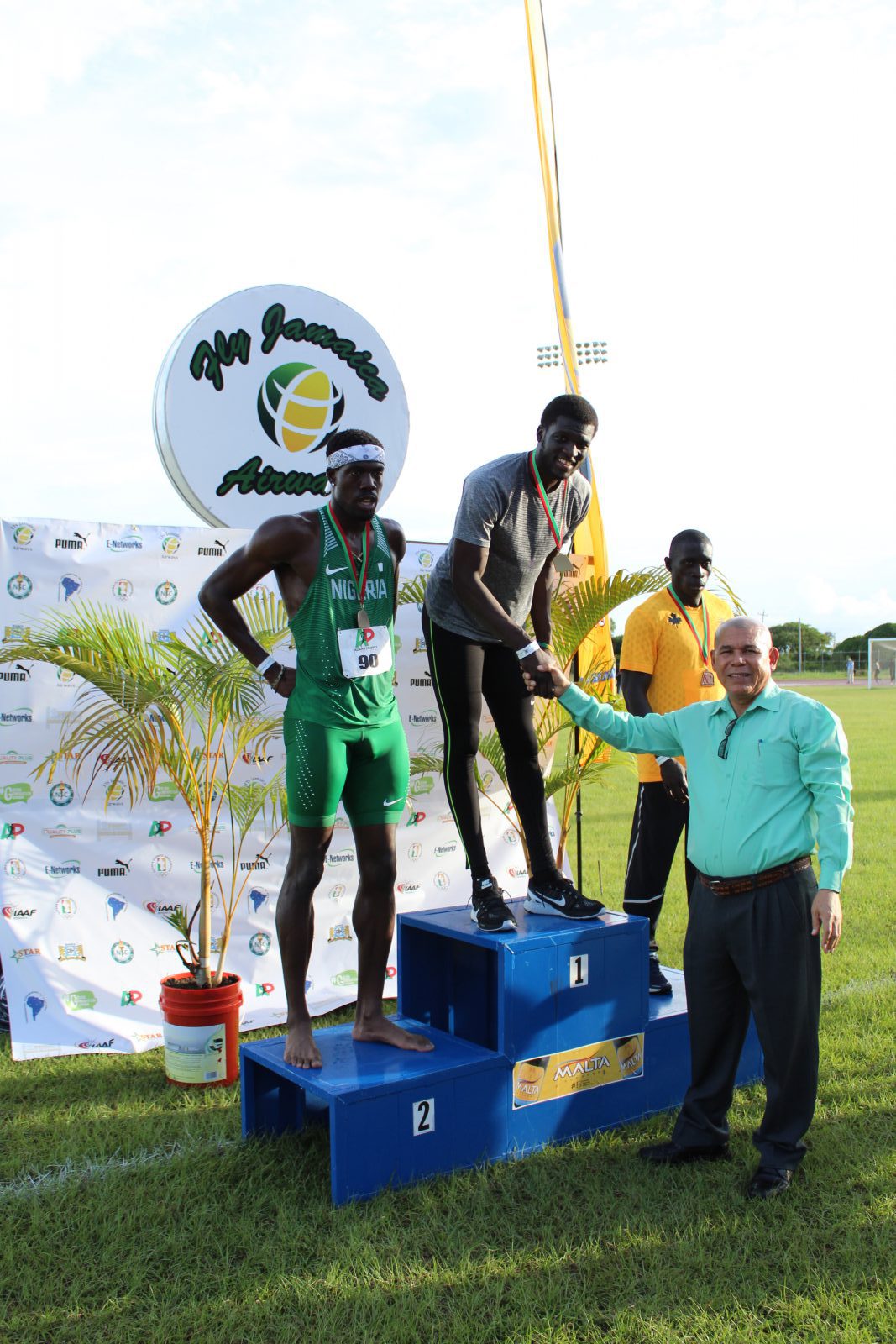 IMG_9220July 1, 2018 Minister of Social Cohesion Dr. George Norton congratulating Kirani James after winning the 400m race