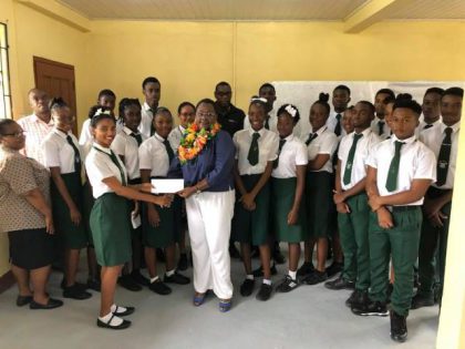 Minister within the Ministry of Natural Resources, Simona Broomes handing over the contribution to the students of Upper Six level of Mackenzie High School.