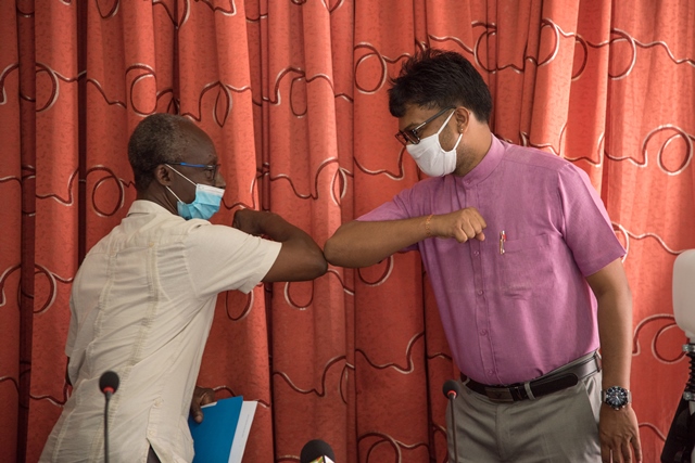 PAHO/WHO Representative, Dr. William Adu-Krow greets City Mayor, Pandit Ubraj Narine