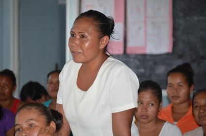 Resident of Assakata Nafissa Daniels, raising an issue with Minister of Indigenous Peoples’ Affairs, Sydney Allicock and his team during a community meeting