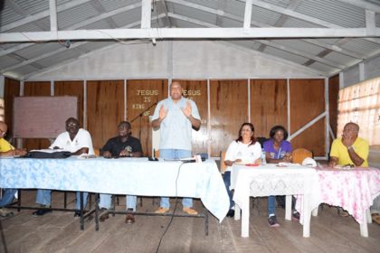 A resident of Imbaimadai raises a concern at the meeting with Minister of Natural Resources, Raphael Trotman