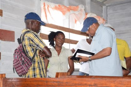 Minister of Natural Resources, Raphael Trotman notes the concern of a resident of Imbaimadai, Region Seven