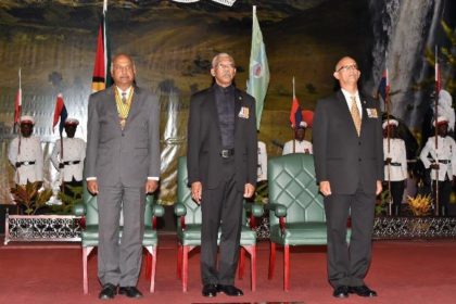 From left: Chancellor of the Judiciary, Justice Carl Singh, President David Granger and Director of Protocol of the Ministry of the Presidency, Colonel (Ret’d) Francis Abraham, during the singing of the National Anthem.
