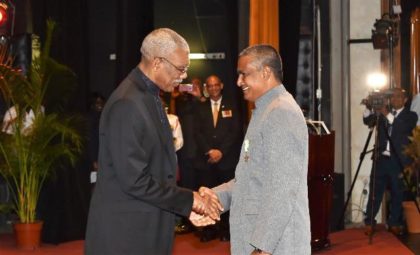 Of those honoured were Speaker of the National Assembly, Dr. Barton Scotland and Mr. Rex McKay, who both received the Order of Roraima, Chief of Staff of the Guyana Defence Force (GDF) Brigadier George Lewis, who received the Military Service Star, Ms. Ingrid Fung, Educator, who received the Golden Arrow of Achievement, Ms. Samiran Bera and Ms. Bissoondai Beniprashad Rayman who both received the Golden Arrow of Achievement, Mr. Inderjeet Beharry and Ambassador Bayney Karran, who received the Cacique’s Crown of Honour.