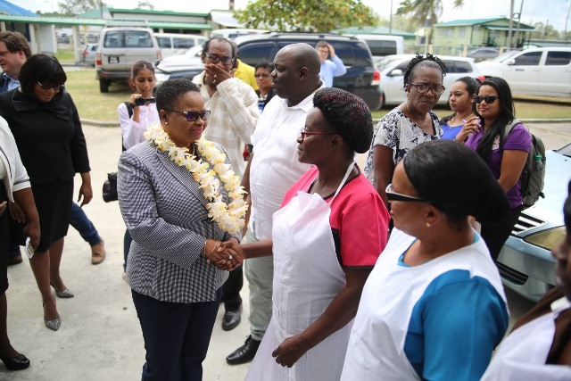 NAApril 3, 2019 Minister of Public Health, Volda Lawrence greets kitchen staff attached to the New Amsterdam Regional Hospital.