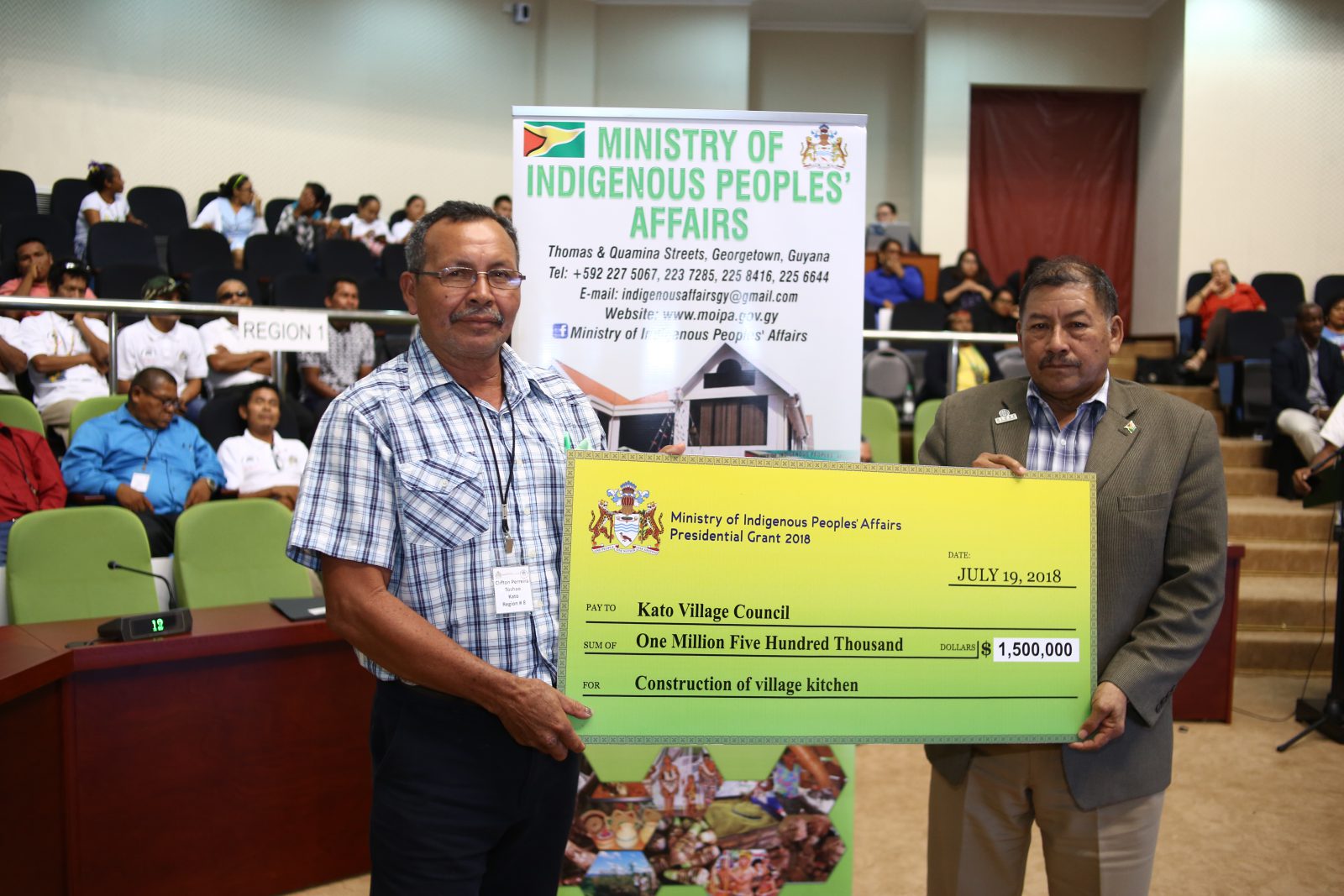 KLG_3005July 20, 2018 Toshao of Kato village Region Eight Clifton Perreira, receiving the presidential Grant from Minister of Indigenous Peoples Affairs, Sydney Allicock.