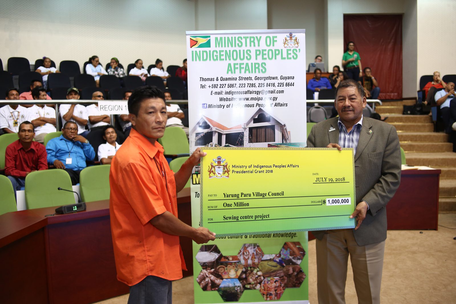 KLG_3021July 20, 2018 Toshao of Yarung Paru Village, Region Nine Shevnarine Cyprian receiving the presidential Grant from Minister of Indigenous Peoples Affairs, Sydney Allicock.