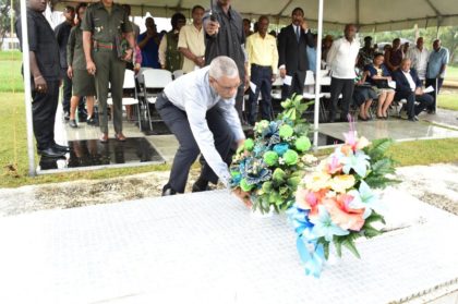 President David Granger places a wreath at the tomb of the late Hugh Desmond Hoyte, S.C., at the Seven Ponds, Botanical Gardens.