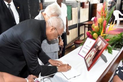 President David Granger signs the Book of Condolences for the late Bishop Randolph George at his funeral service, held at the St. George’s Cathedral