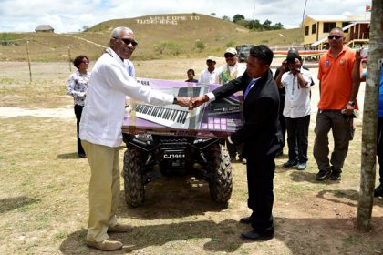 President David Granger hands over a All-terrain vehicle to the Community Development Officer.