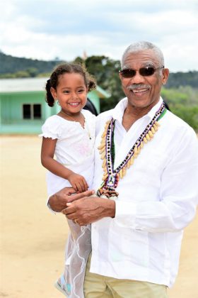 President David Granger takes a photo opportunity with this pretty little girl at Tuseneng.