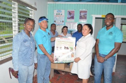 Minister of Public Health, Dr. George Norton hands over drugs and other medical supplies, including health care protocols to Community Health Worker of Cabrora Health Post, Cheryl Gonsalves