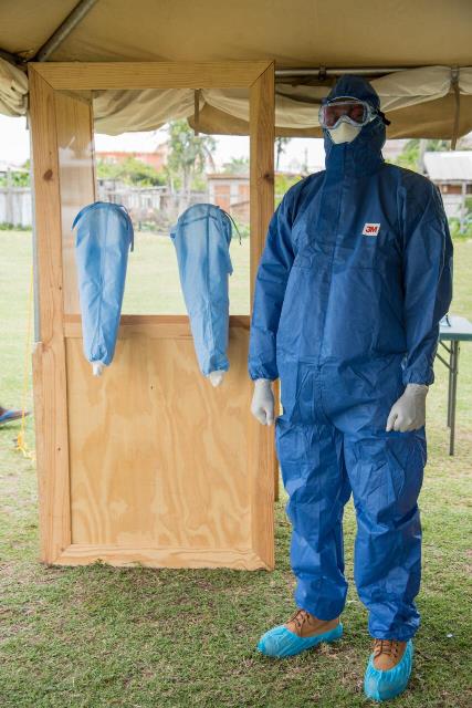 A suited-up Dr. Keon Harmon who is in charge of the mobile testing unit in Sophia stands near the screening booth