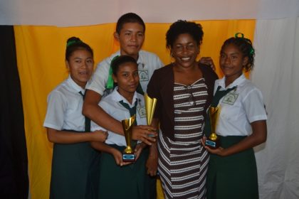 St. Ignatius Secondary displaying their trophy with their Head Teacher Yvette Archer.